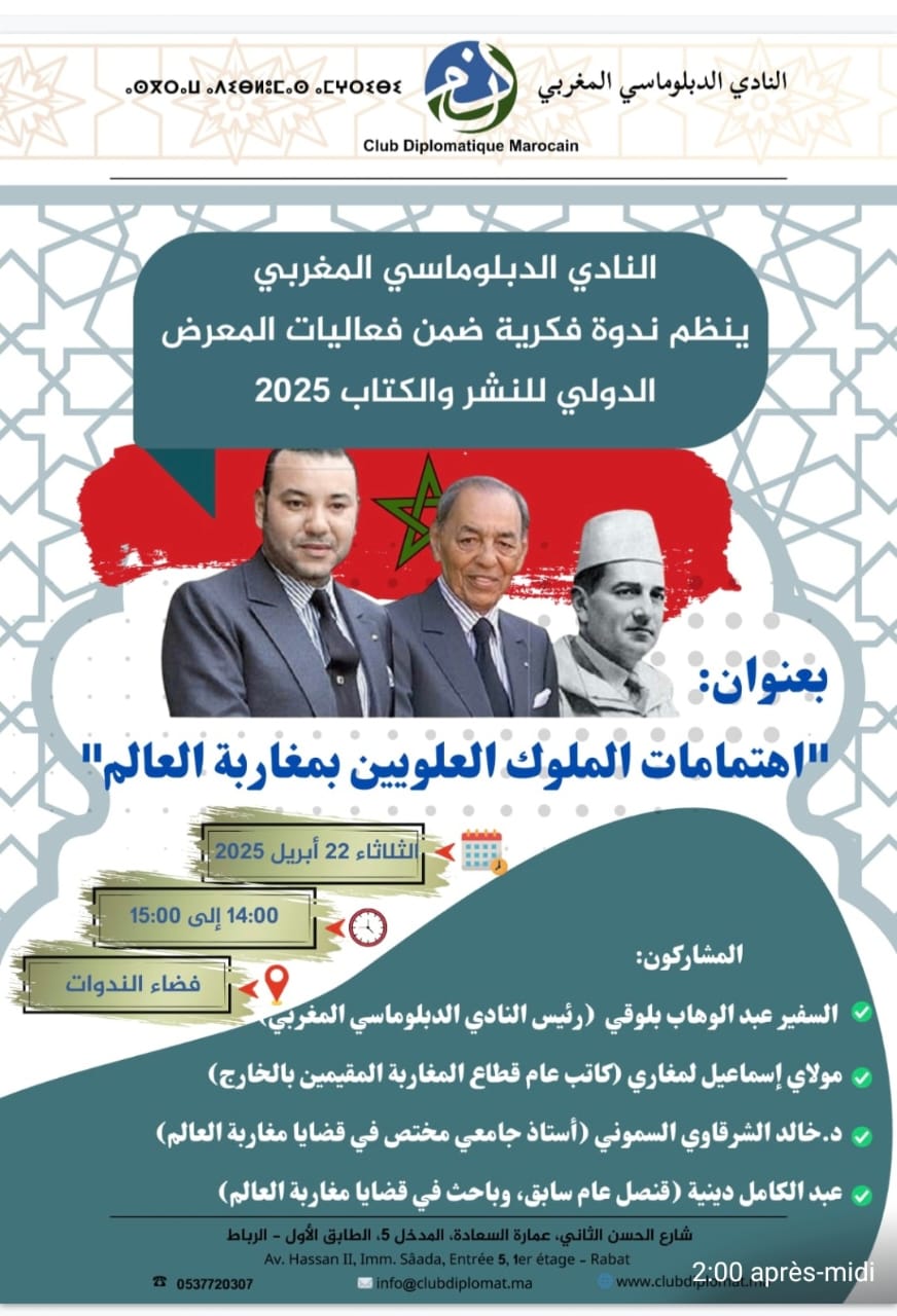 ينظم النادي الدبلوماسي المغربي ندوة فكرية ضمن فعاليات المعرض الدولي للنشر والكتاب 2025 بالرباط ، بعنوان اهتمامات الملوك العلويين بمغاربة “العالم” ، وذلك يوم الثلاثاء 22 أبريل 2025 من الساعة الثانية إلى الساعة الثالثة زوالا ، بفضاء الندوات بالمعرض الدولي للنشر والكتاب .ويشارك في هذه الندوة :